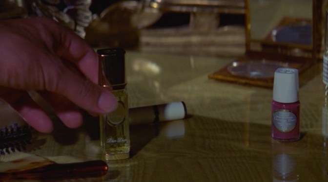 Two Christian Dior fragrances make an appearance in the film. The small atomiser is Dior-Dior, a chypre floral fragrance created by Edmond Roudnitska and launched in 1976. The houndstooth bottle contains Miss Dior, the lily-of-the-valley masterpiece created by Jean Carles and Paul Vacher, and launched in 1947.