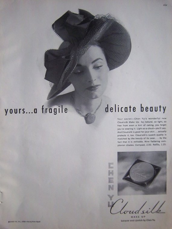 On the Cloud Silk compact there’s a smaller box whose lid reads “Dorothy Perkins”, a name which is still present on the market as a clothing brand. Back in the 1940s it produced make-up items, too. I don’t know exactly what the round box in the screencap above contained, but I guess it was rouge or face powder.