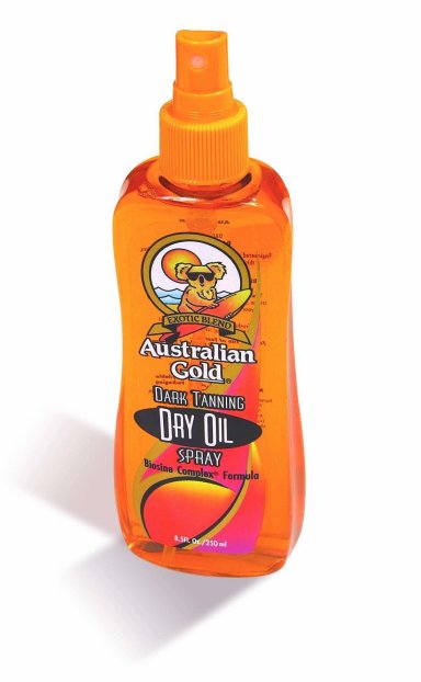 On the top shelf there are also bottles of dark-tanning dry oil spray.