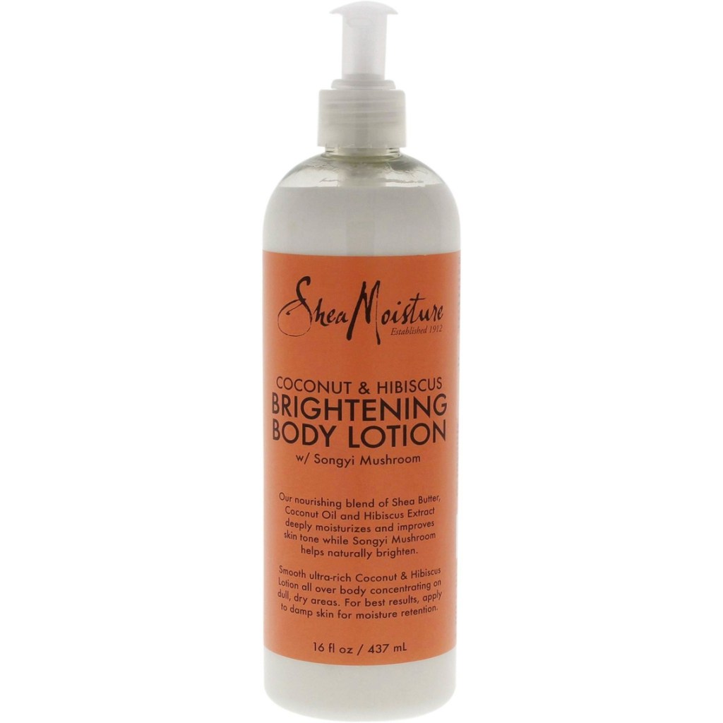 The tall plastic bottle is Shea Moisture coconut and hibiscus brightening body lotion.