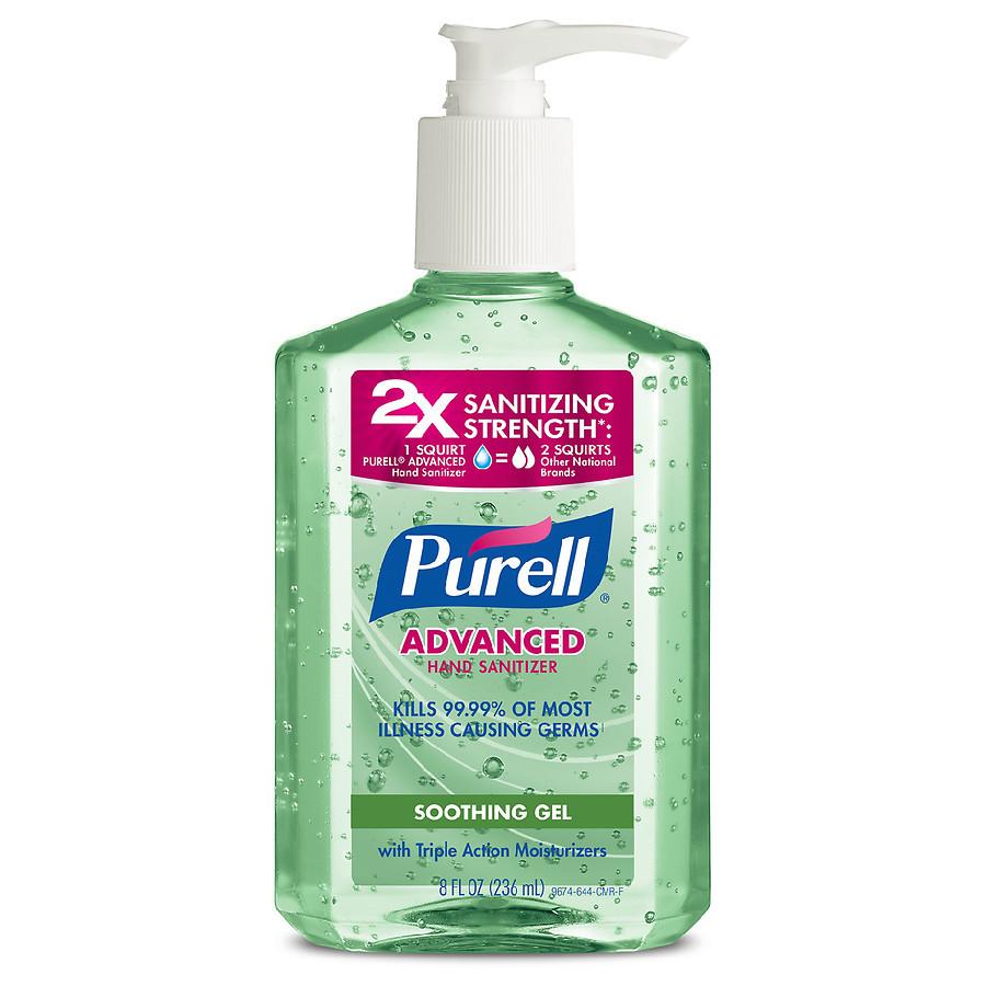 The green pump bottle on the left is Purell hand sanitizer (the front label has been removed).