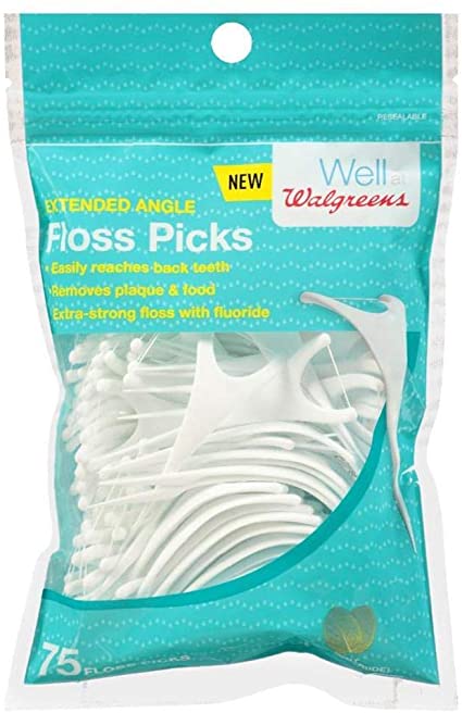 The plastic bag in the background contains a discontinued product – Walgreens extended-angle floss picks.