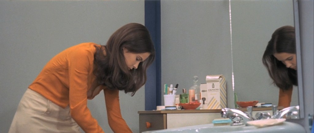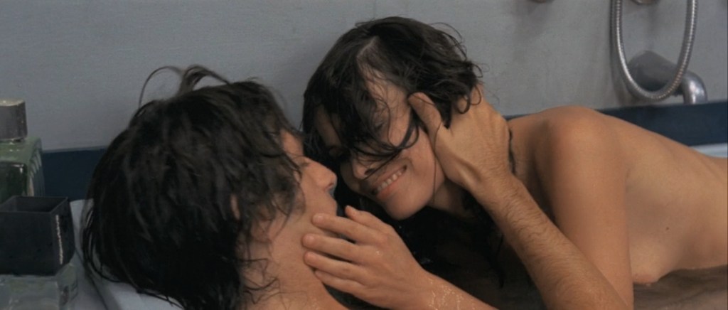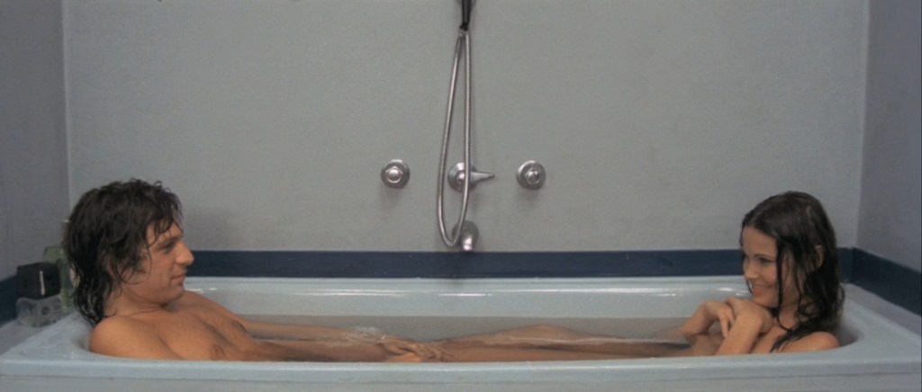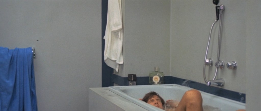 Dalia (Francine Racette) has convinced Roberto (Michael Brandon) to take a bath. In his bathroom there are two perfume boxes, a prelude to the bottles which will be soon seen by the tub.