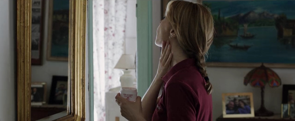 Luciana (Paola Cortellesi) is getting ready for work. The moisturizer she’s applying is a quintessentially Italian beauty product, Cera di Cupra, first created in 1957.