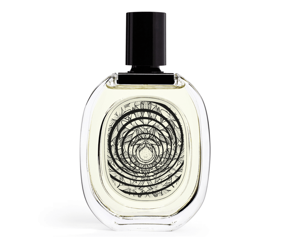 The first bottle from the left is by Diptyque. It’s impossible to tell what fragrance it houses but it could be an eau de parfum, judging from the dark glass.