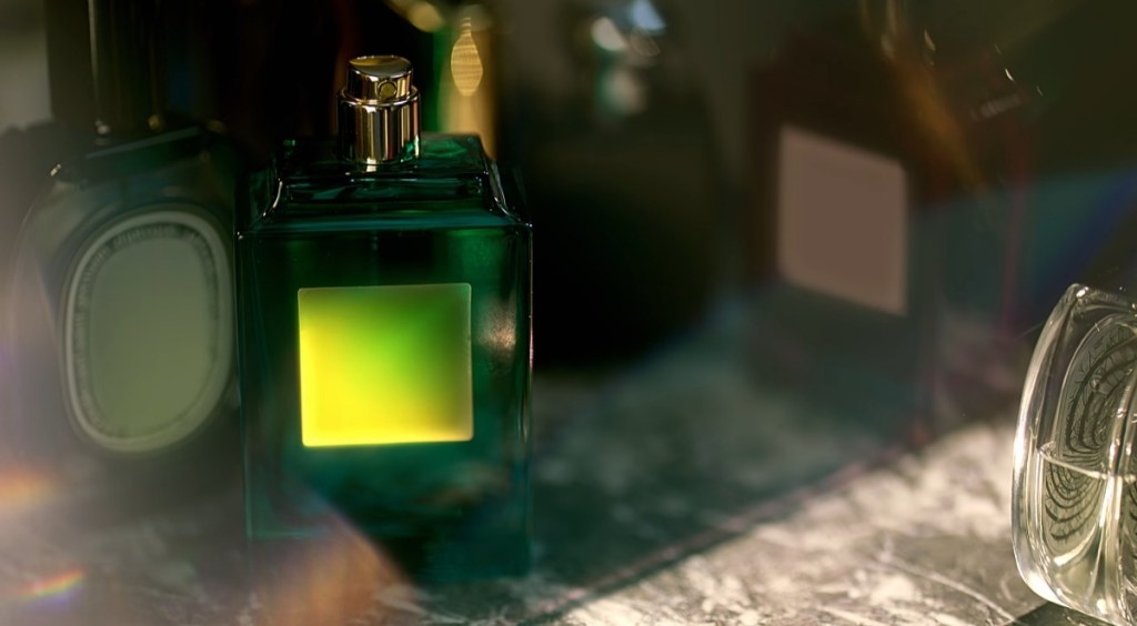 The last shot shows other perfume bottles not previously shown.