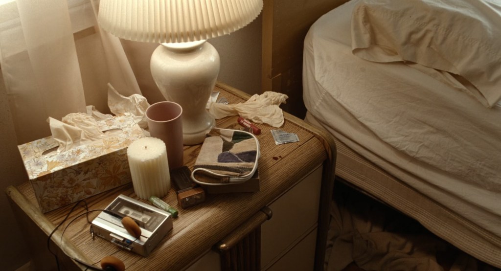 There are two Bonne Bell Lip Smackers lip balms on Maren’s bedside table: the flavours are Watermelon (green tube) and Cherry (red tube).