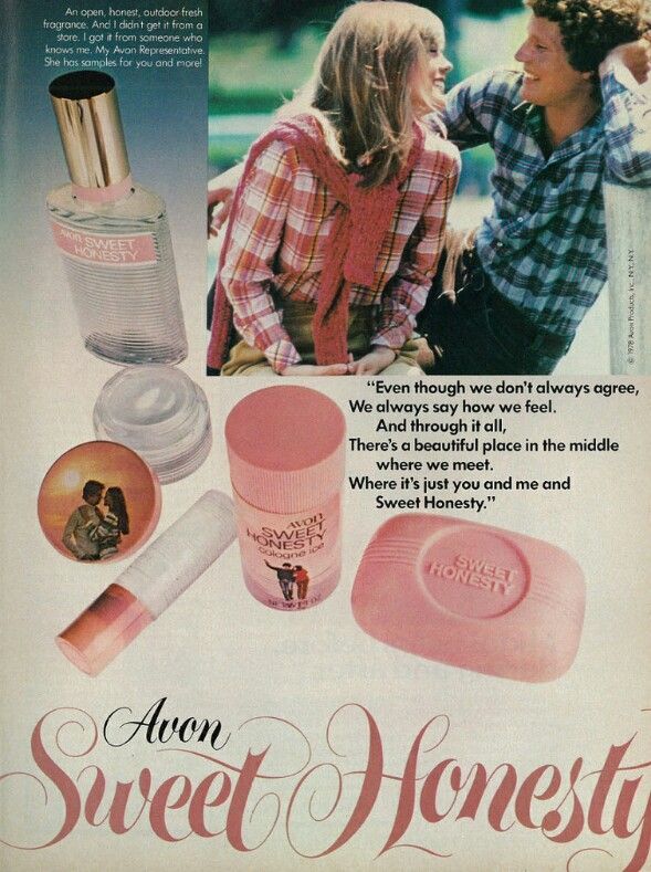 The bottle with the pink front label is Avon Sweet Honesty, a floral fragrance launched in 1973.