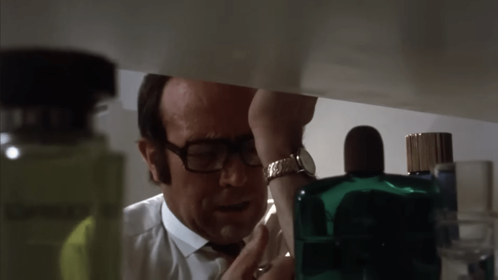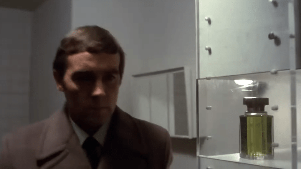 A bottle of Hermès Equipage takes centre stage: the camera lingers on it several times. This aromatic eau de toilette by Guy Robert was launched in 1970.
