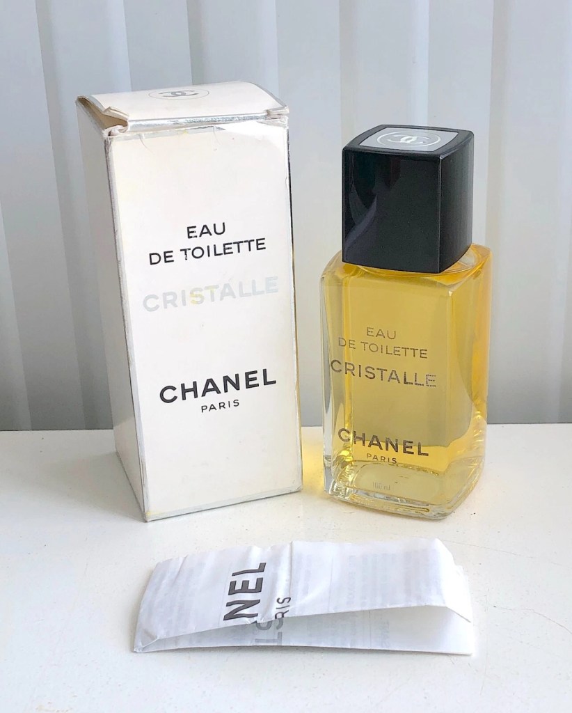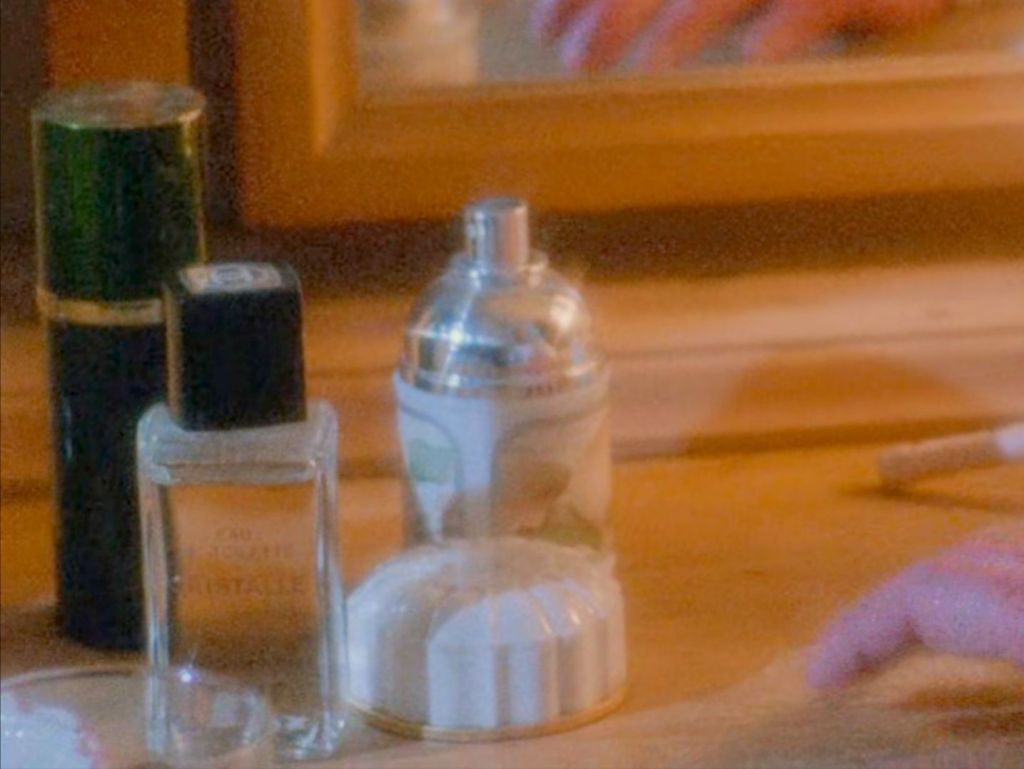 Next to it there’s a splash bottle of Chanel Cristalle eau de toilette, a citrus aromatic fragrance created by Henri Robert and launched in 1974.