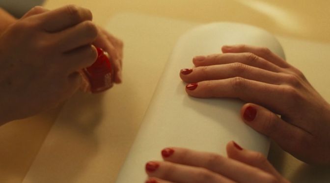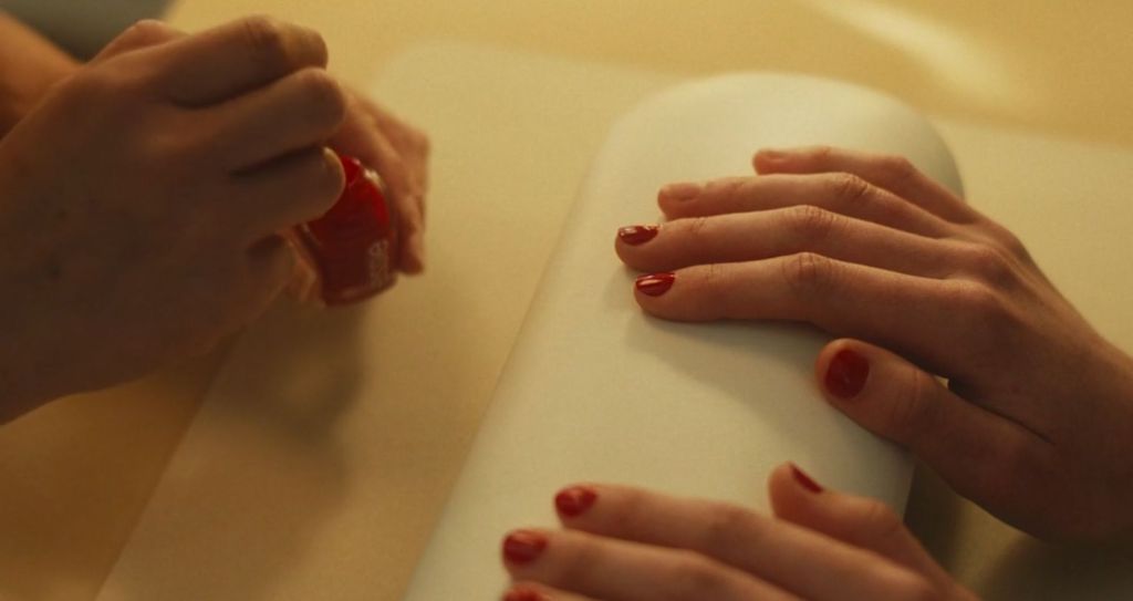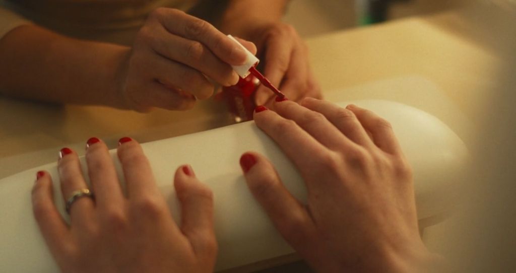 Carolyn is getting a manicure. The red nail polish they’re applying on her nails is by Essie. The exact shade used in the episode is Red-y for Bed, which didn’t exist in the 1990s. In the same way, the specific bottle seen in the episode didn’t exist back then.