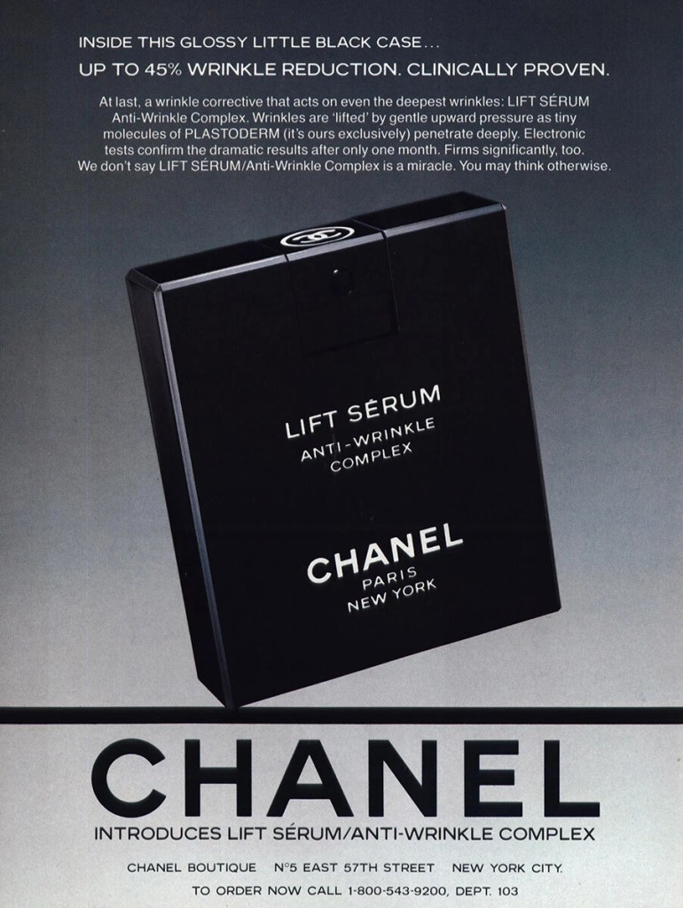 A different angle reveals another factice – a massive black glossy case of Chanel Lift Sérum, an anti-aging product launched in the late 1970s.