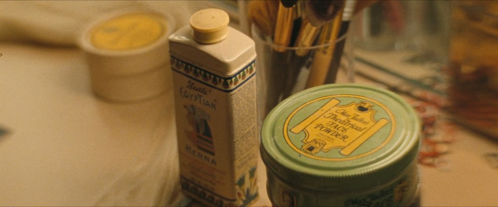 Despite the constant off-focus quality that characterises most of the scenes set in the dressing room of the Razzle Dazzle revue show, some clearer shots give us the chance to see what products sit on the vanities of the showgirls. Not surprisingly, some of them are vintage items, a detail that reinforces the strong divide between past and present analysed in the film.