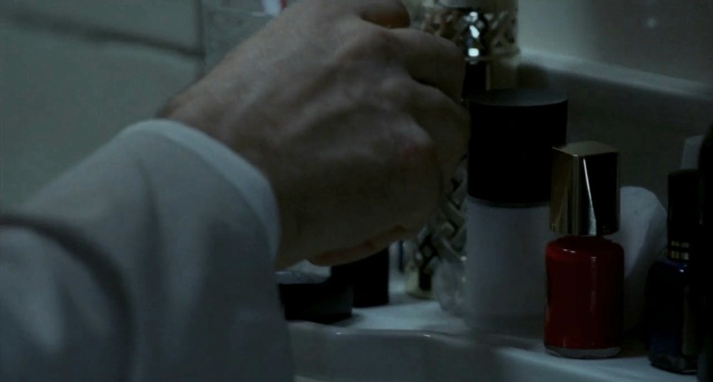 The Man (Rocco Siffredi) picks up a lipstick from the bathroom of the Woman – a scene that gives us a chance to see what’s on the shelf above the washbasin.