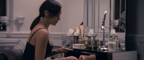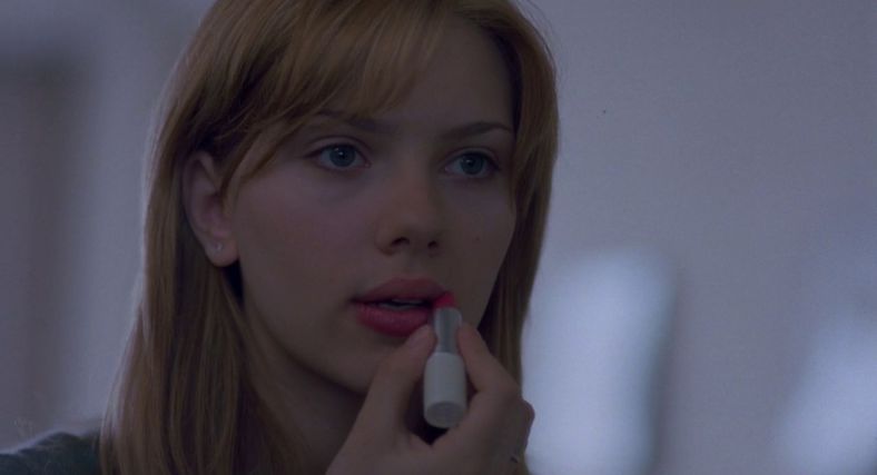 Charlotte (Scarlett Johansson) uses Clinique Different lipstick in Raspberry Glacé (aqua green casing).