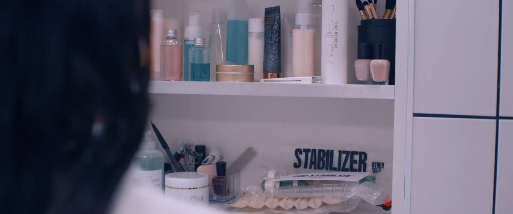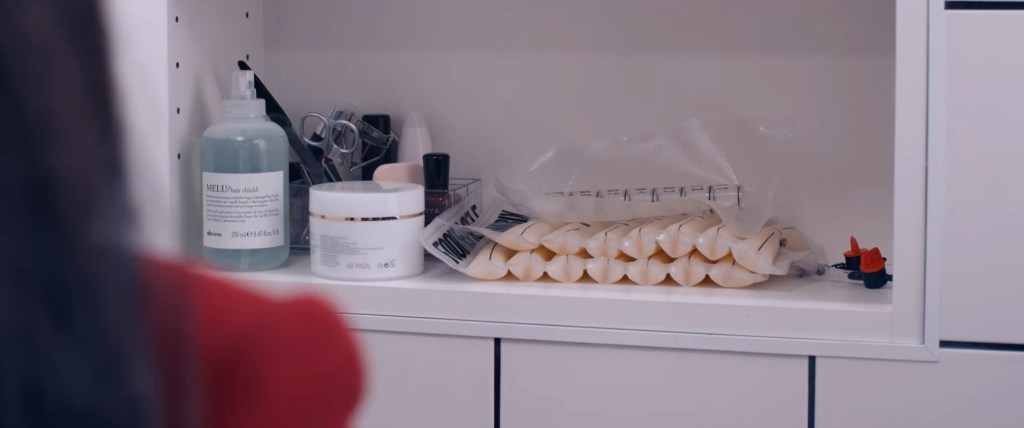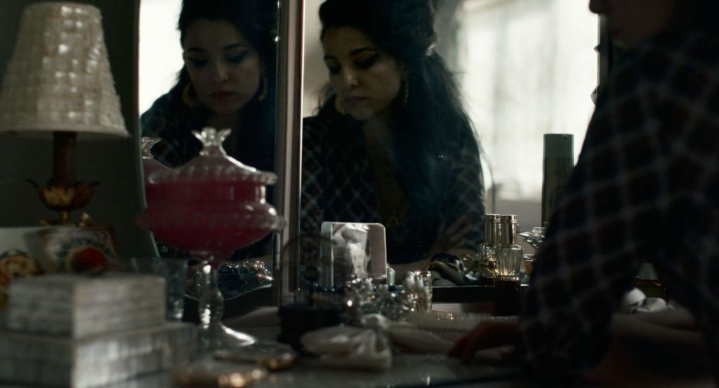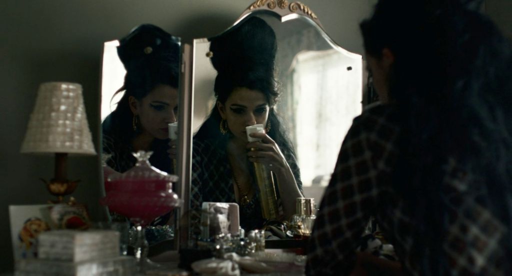 In the aftermath of the death of Amy’s grandmother Cynthia, the singer (Marisa Abela) sits at her vanity. This is an interesting scene because we get to see some of the beauty products and perfumes used by Cynthia, one of the main inspirations behind Amy’s music tastes and unique look.