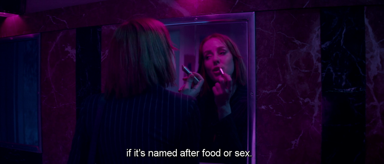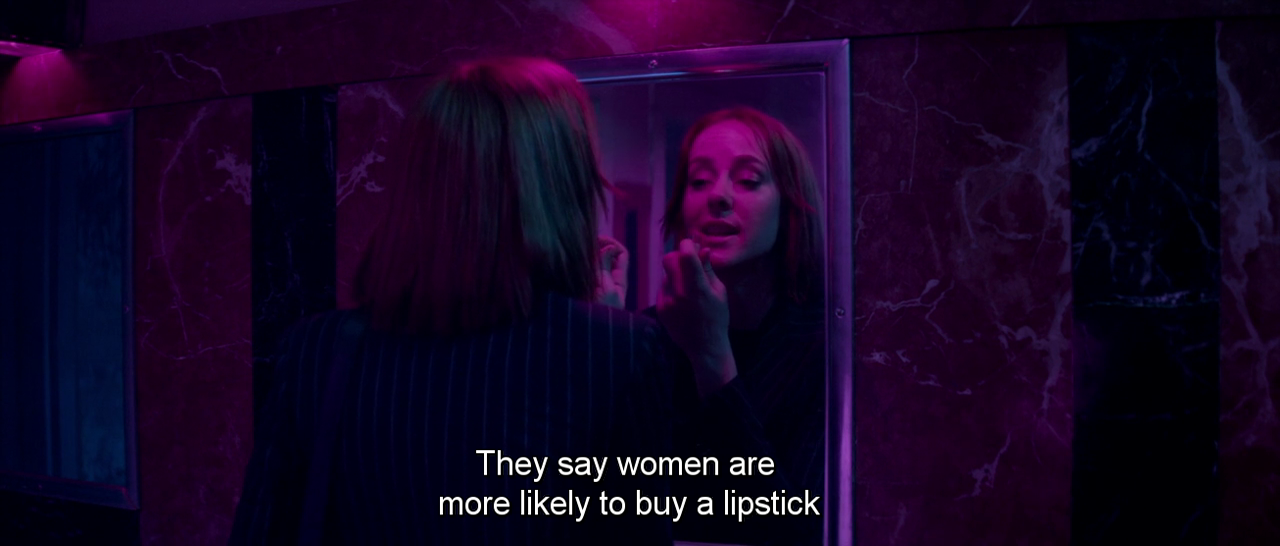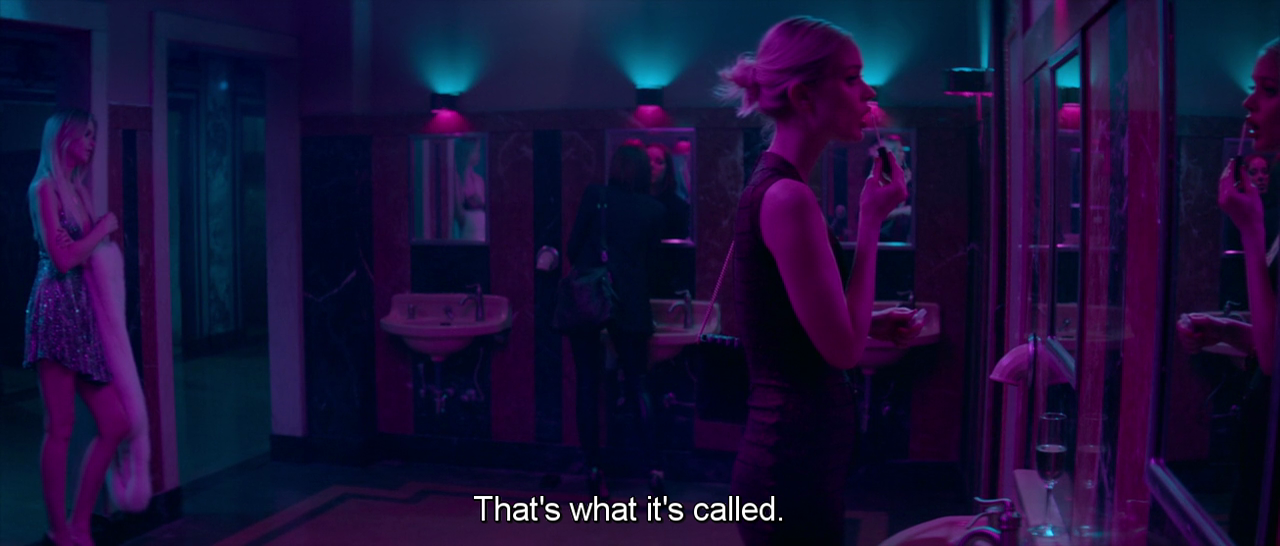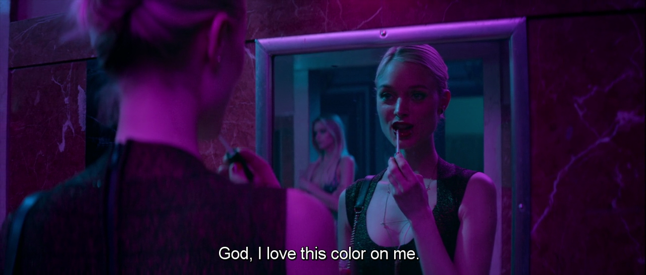 When the main four characters – the make-up artist Ruby (Jena Malone), the models Sarah (Abbey Lee) and Gigi (Bella Heathcote), and the newcomer Jesse (Elle Fanning) – first meet, they have a conversation about lipsticks. Gigi kicks it off by saying she loves the lip colour she’s wearing; Ruby comments on the name of the shade – Redrum[1].