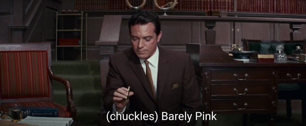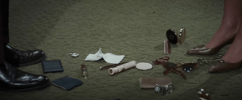 Lyon picks it up: it’s a lipstick. Funny how he immediately checks the shade on the bottom of the tube.