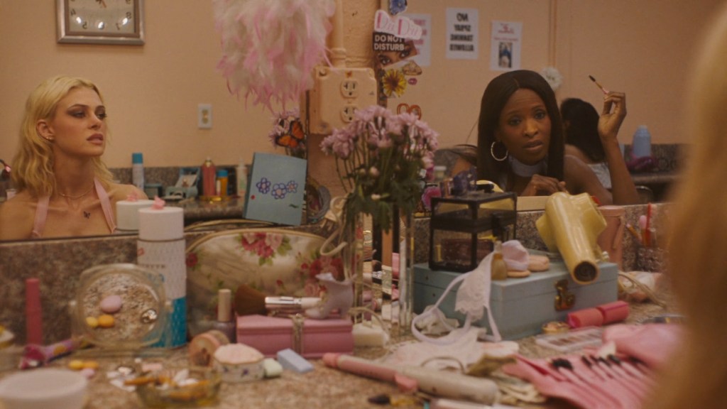 Lola’s dressing table at the strip club where she works is full of make-up products and beauty tools.