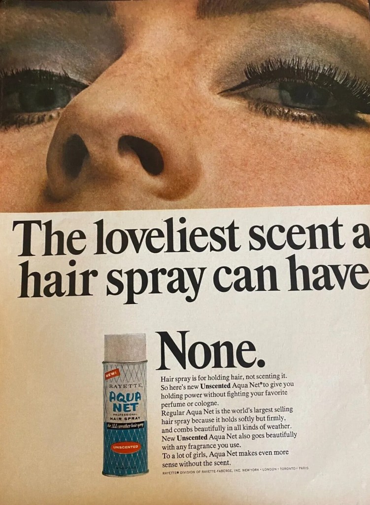 Another surprising choice is Rayette Aqua Net unscented hairspray. This is the vintage version, so I wonder why it appears in a film that is clearly set nowadays.