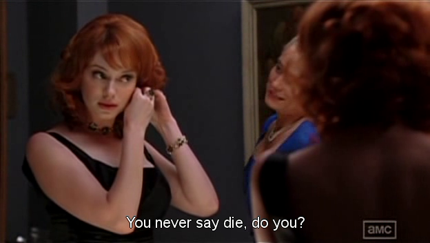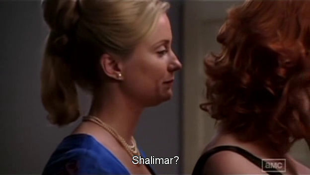 Carol McCardy (Kate Norby) and Joan Holloway (Christina Hendricks) are getting dressed for a night out. Carol comments on Joan’s perfume: we learn that she wears a classic – Guerlain Shalimar, perfect for a seductress like Joan.