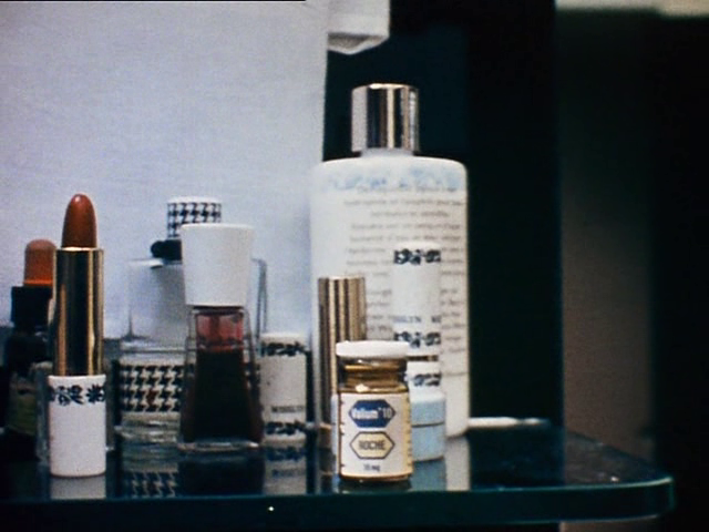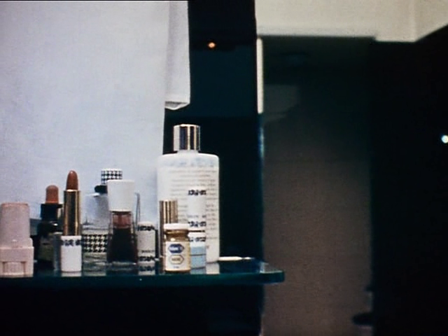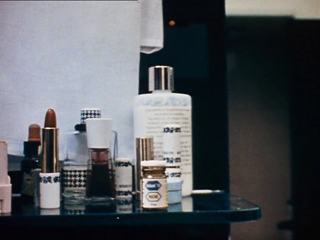 In the screencap above, three bottles of Lucien Lelong Sirocco and a giant bottle of Elsa Schiaparelli Shocking can be seen. Sirocco was launched in 1934, while Shocking – a creation by Jean Carles – was launched in 1937.