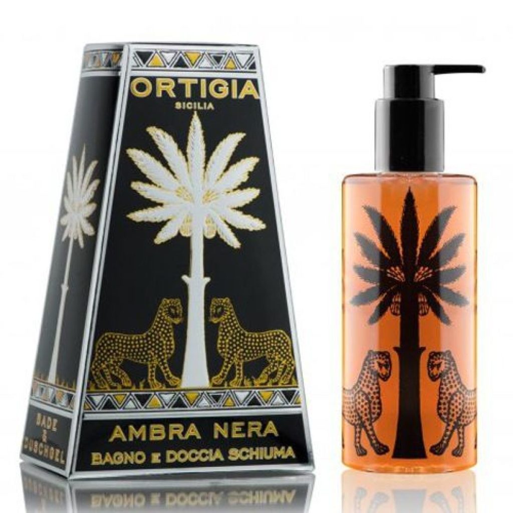 The pump bottle contains Ortigia Ambra Nera bath and shower gel.