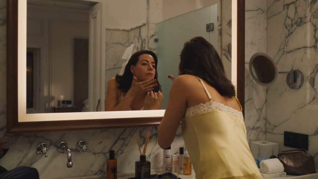 Renata is in her bathroom after the lavish disco party she’s thrown for her daughter Amabella. By the sink there are Krigler Charming California 215 scented candle and Jo Malone Peony & Blush Suede shower oil.