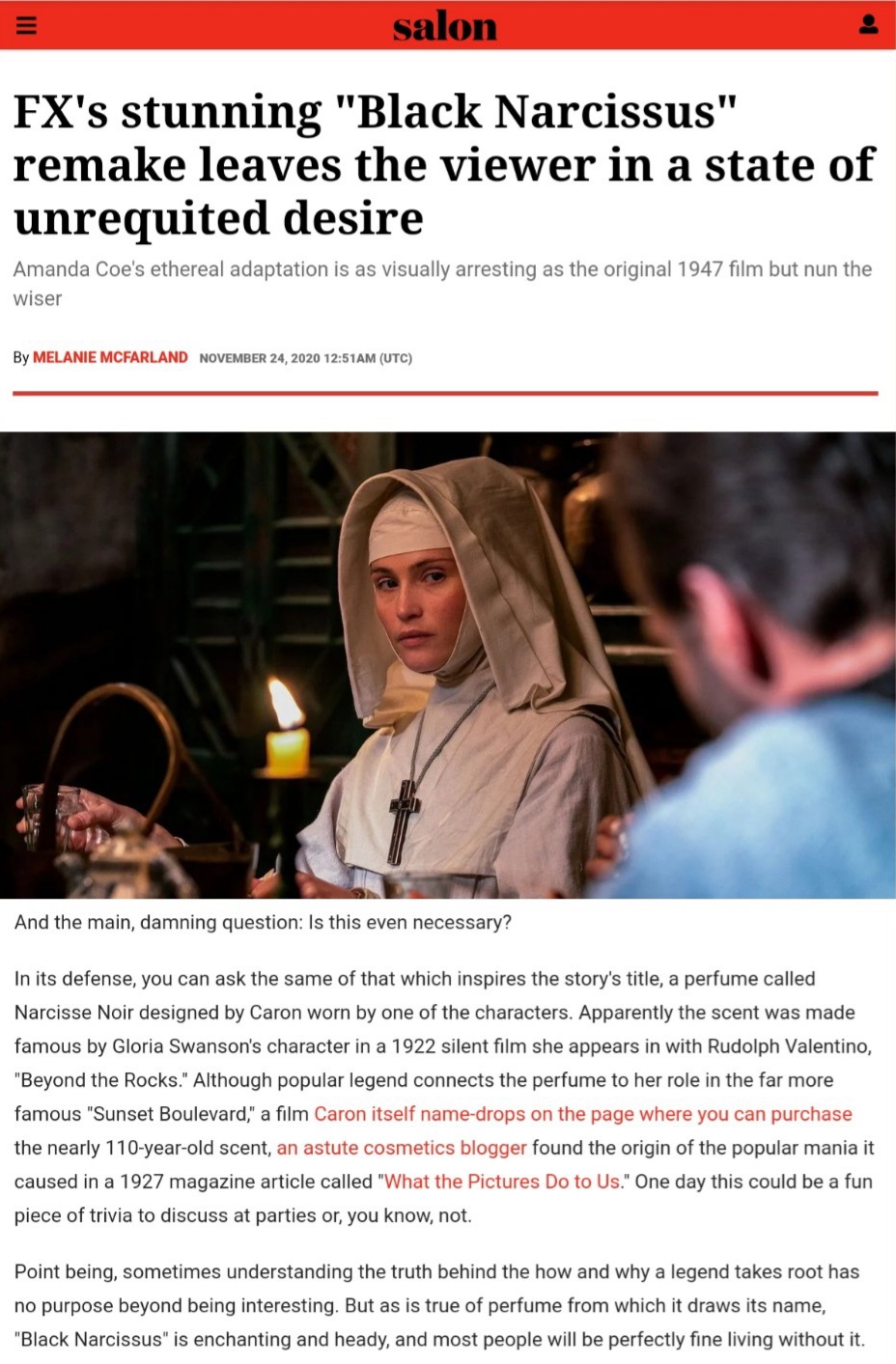 FX’s Stunning “Black Narcissus” remake leaves the viewer in a state of unrequited desire by Melanie McFarland, Salon, November 24th, 2020