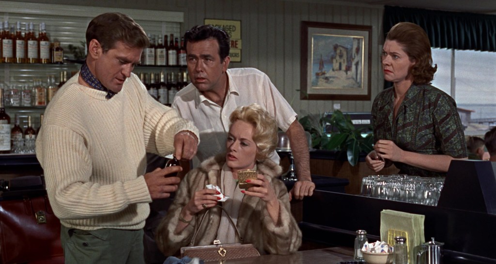 Once in Bodega Bay, Melanie (Tippi Hedren) gets attacked by a seagull. Mitch (Rod Taylor) tends to her head wound after taking her into a diner.