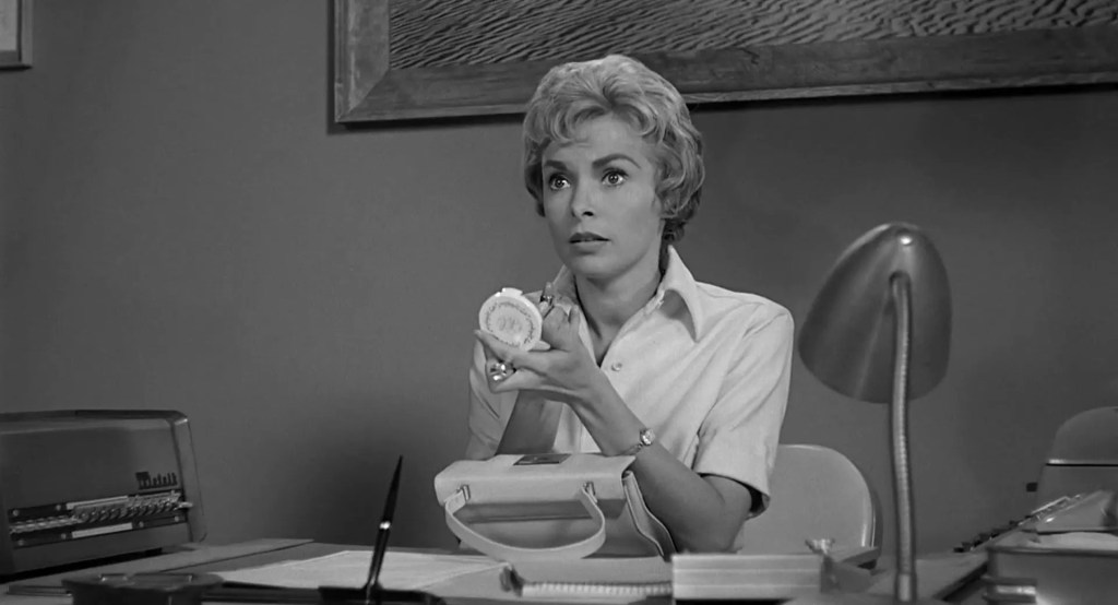 Marion (Janet Leigh) is retouching her make-up. To do so, she’s holding a Max Factor compact: it’s Creme Puff creamy make-up base and powder.