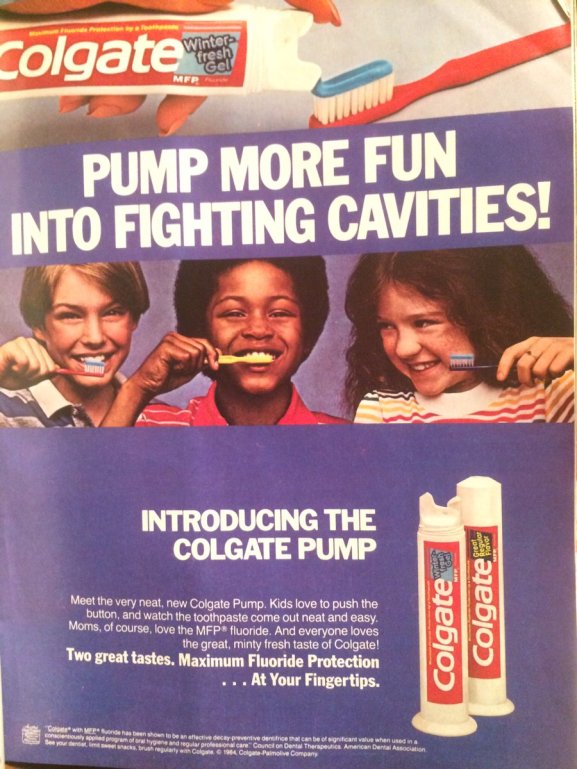On the marble counter behind Ellen there’s a pump tube of Colgate toothpaste.