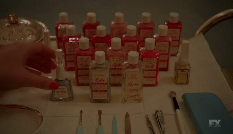The first bottle on the left is the Cutex nail polish Joan will opt for: the shade is Sterling Silver, which will match her Edith Head silver dress and Van Cleef and Arpels diamond jewellery.