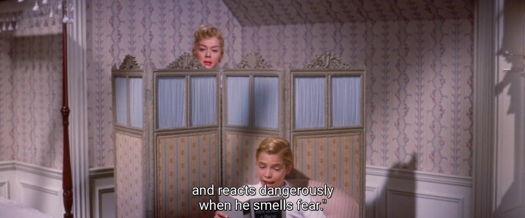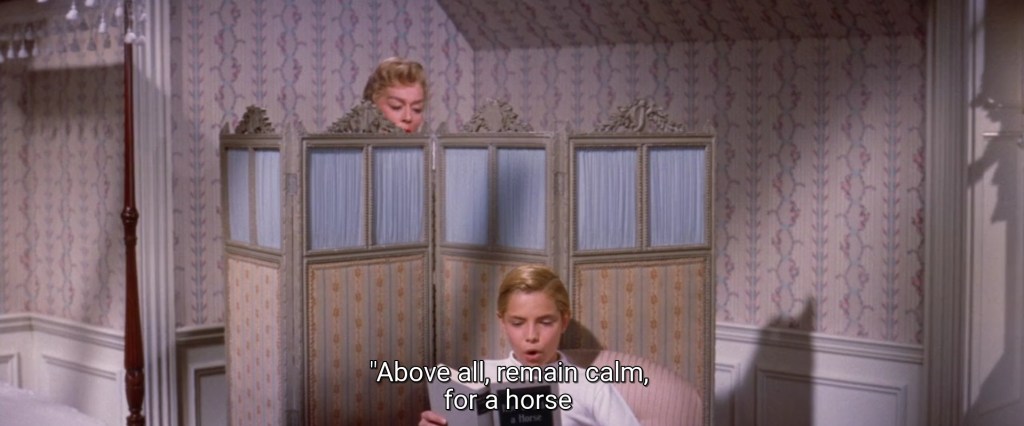 When Mame (Rosalind Russell) and Patrick (Jan Handzlik) first visit Beauregard Jackson Pickett Burnside (Mame’s soon-to-be husband) and his family in Georgia, drama ensues: they organise a fox hunt, but Mame has never ridden a horse before. Patrick explains horses can “smell fear.” Mame comments she hopes the horse “likes Chanel No. 5”, thus letting us know the perfume she’s wearing.