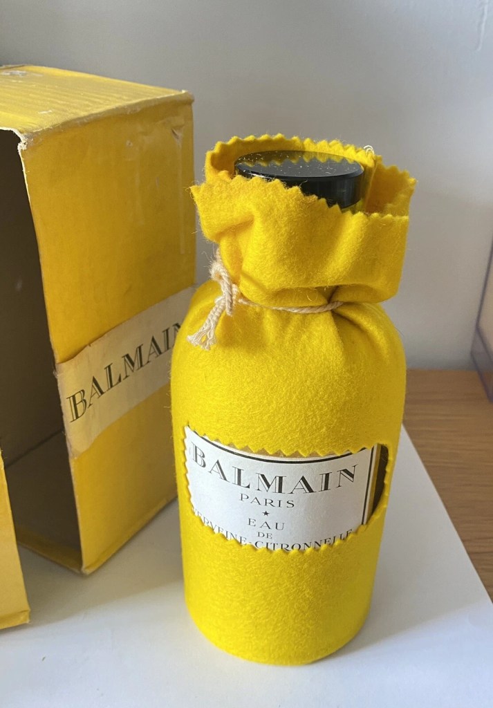 The yellow pouch housed Eau de Verveine Citronelle, a 1951 verbena fragrance that would be later renamed as Monsieur Balmain.