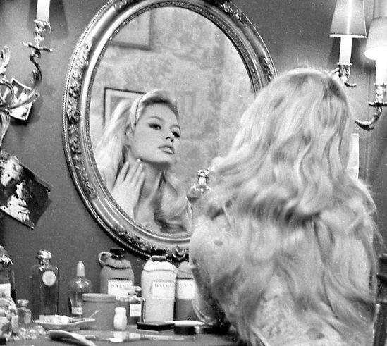 Brigitte Bardot had this beautiful set of photos taken by Luc Fournol in her Paris apartment, 71 Avenue Paul Doumer, in 1958. Her dog Guapa kept her company by sitting under the vanity, where lots of interesting bottles can be seen,