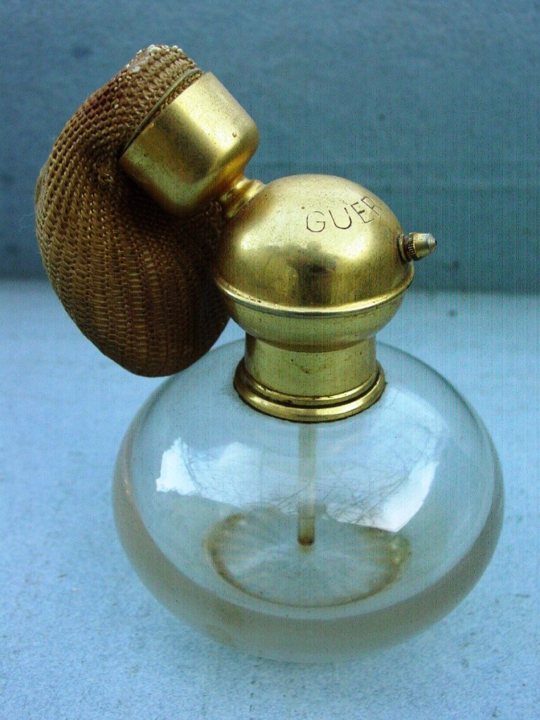 On the right there are two Guerlain bottles. The white container decorated with a blue floral pattern is the refillable atomiser of Shalimar, while the fluted one is the spray version of Shalimar eau de cologne. Behind them, the fan-like cap of the classic flacon chauve souris is visible, but it seems attached to a different bottle.