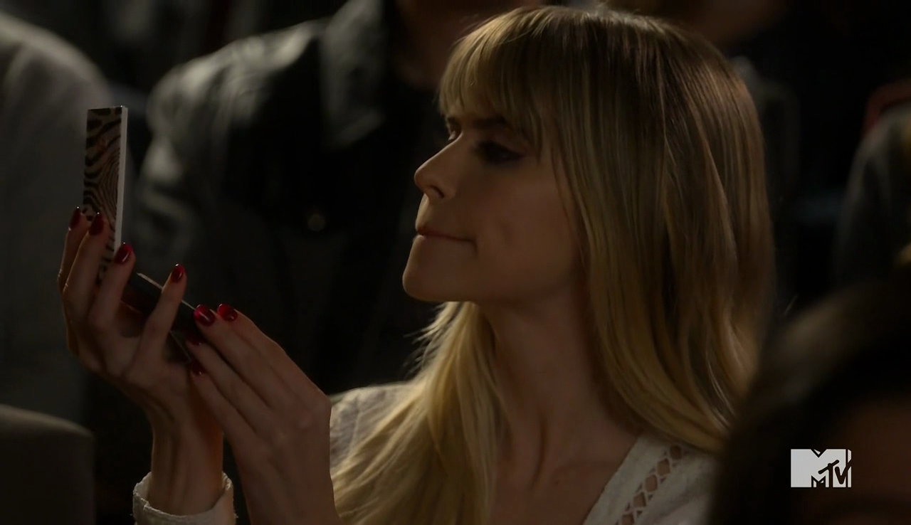 Just before getting on stage and discovering the truth about Jake, Brooke Maddox (Carlson Young) checks her make-up on the mirror of a Sisley zebra-print compact, the blush duo Phyto-Blush Eclat.