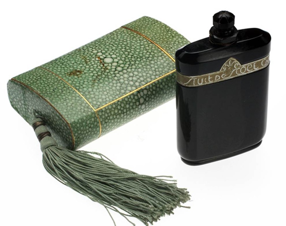 Last, a Caron fragrance in the trademark ring round bottle. The front label cannot be read, though, so we don’t know what fragrance it contains.