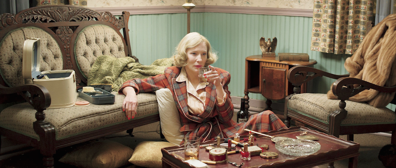 Kathryn (Cate Blanchett) is getting dressed for dinner at home. She’s putting on a pair of earrings (a gift from her husband) while sitting at her dressing table, where we can see different make-up products and fragrance bottles.