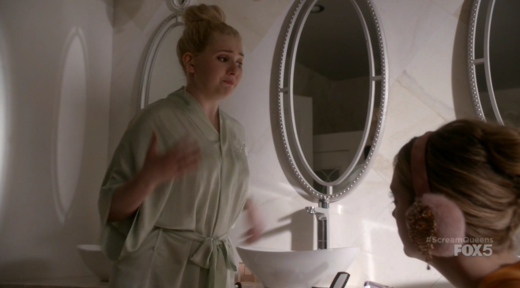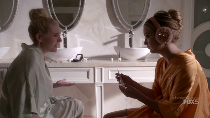 With the Red Devil killing spree still going strong, Chanel #5 (Abigail Breslin) and Chanel #3 (Billie Lourd) seal the pact of surviving Chanel Oberlin, the co-president of the Kappa House. In this scene, Chanel #3 is doing her pedicure, using Christian Louboutin Loubi nail care kit, which includes a nail primer and a nail gloss. On the marble counter, a Chanel blush compact can be seen.