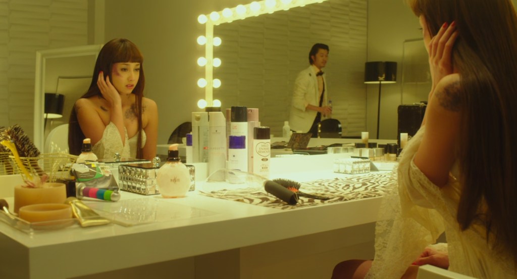 In classic Almodóvar style, Chanel products make their appearance. In this case, there are a compact and a bottle of bi-phase make-up remover (or toner). There’s also a black box with gold band I haven’t been able to identify. It may be related to No. 5, but I have no idea what it can be.