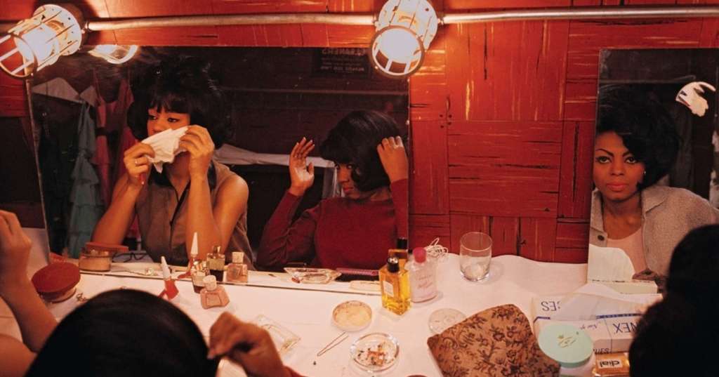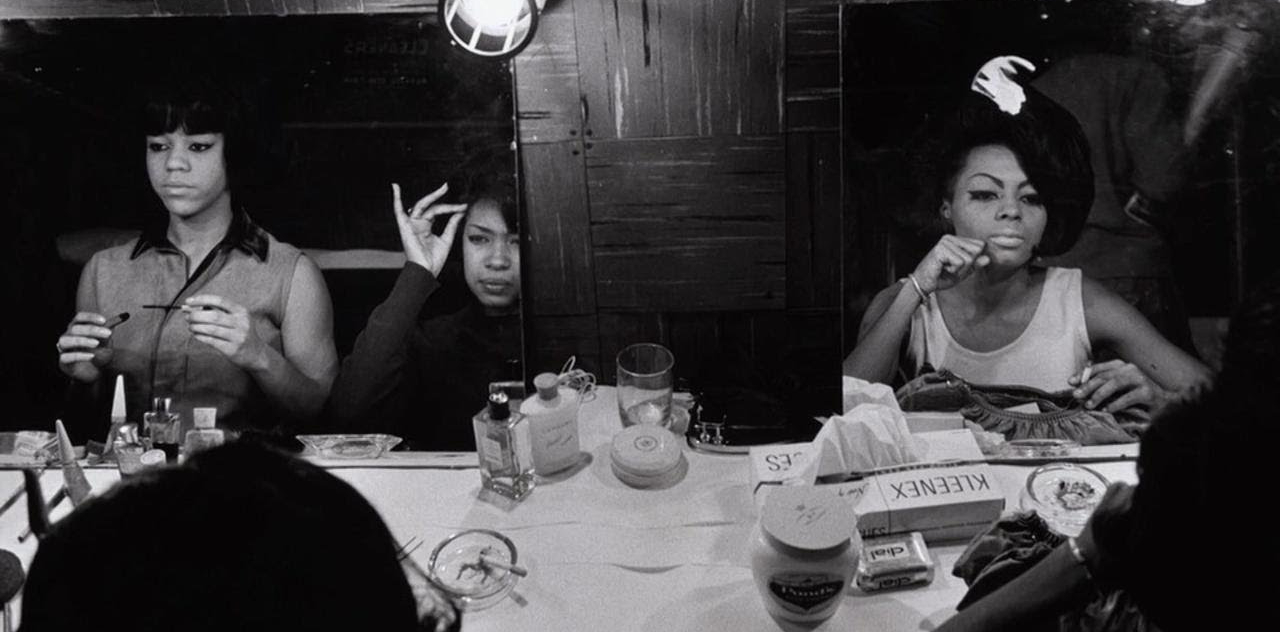 Photographer Pierre Fournier portrayed the French singer and actor Johnny Hallyday in his dressing room at the Olympia music hall in Paris in 1965. The room walls are plastered with telegrams, while two interesting bottles sit on the table.