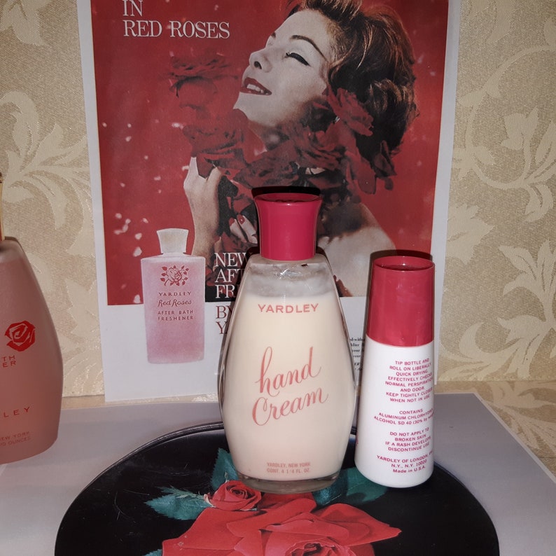 On a glass shelf there’s Elizabeth Arden Blue Grass dusting powder.