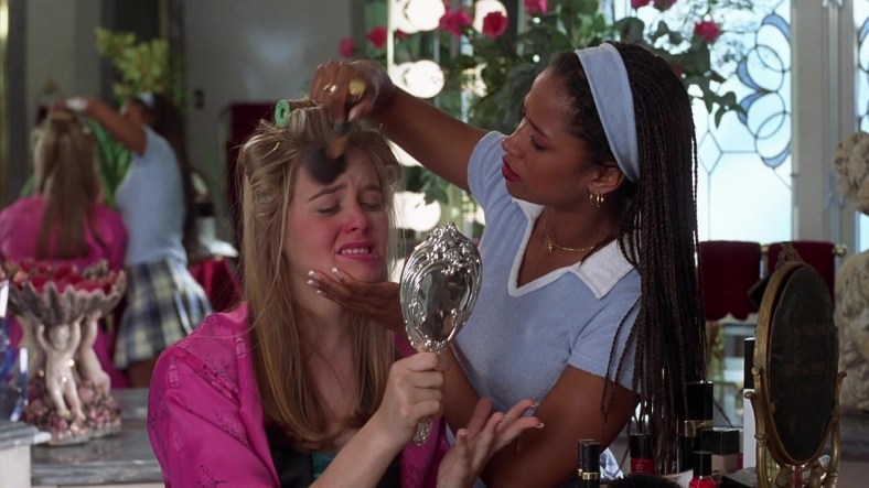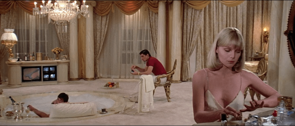 Béatrice (Catherine Deneuve) has a very interesting selection of fragrances and beauty products on her bathroom glass shelf.