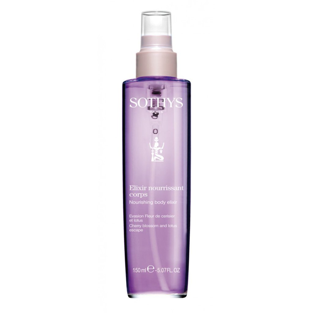 The purple spray bottle contains Sothys Elixir Nourissant Corps nourishing body elixir in Fleur de cerisier et Lotus.