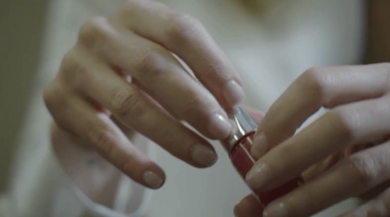 The red lipstick he takes from the shelf is from the fictional brand The Tools.