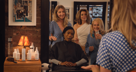 The scene where Carol (Angela Bassett) gets a drastic hair make-over thanks to Erin (Heidi Gardner) takes place at a real NYC’s Lower East Side salon, the Fringe. So it’s quite obvious to see the salon’s own haircare line (Fringe & Friends, launched in 2007) on display, along with the ubiquitous Mason & Pearson brush.