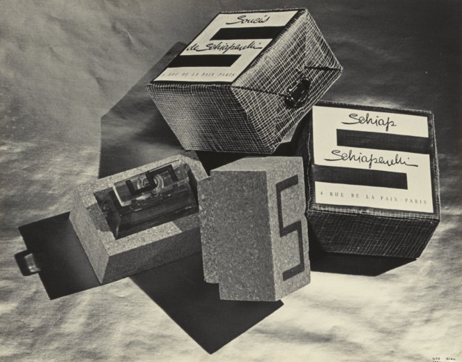 Right in front of Sonja there’s a box of Elsa Schiaparelli Salut perfume. The Ilse Bing advertising picture above, dated 1934, shows how the same box was used for other perfumes, too (Soucis and Schiap). The animalic lily fragrance was launched in 1934.