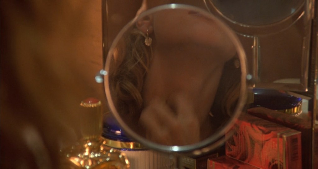 The trademark ring-shaped bottle we can see on the counter is Bijan Women eau de parfum, a white floral fragrance by Peter Bohm launched in 1986.